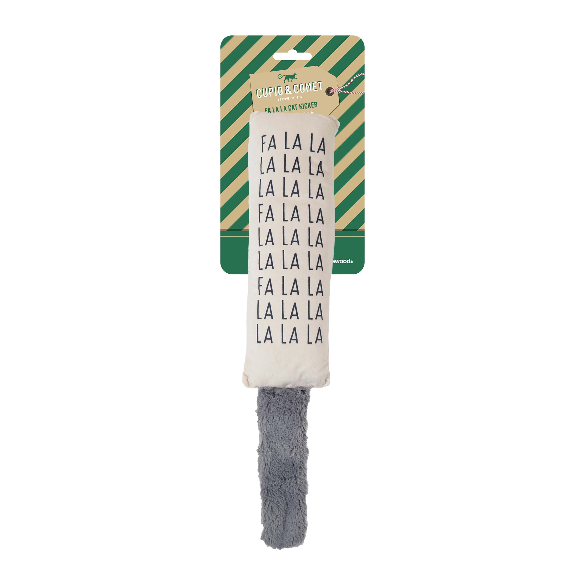 Rosewood Christmasmas Fa La La Cat Kicker. Rosewood's Fa La La Cat Kicker is a long, soft shape with catnip which is great to encourage hind paw kicking, pouncing and playing! The crinkle sound and grey tail add interactivity. The soft material makes it perfect for cuddles.