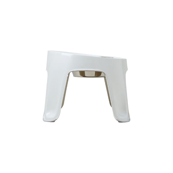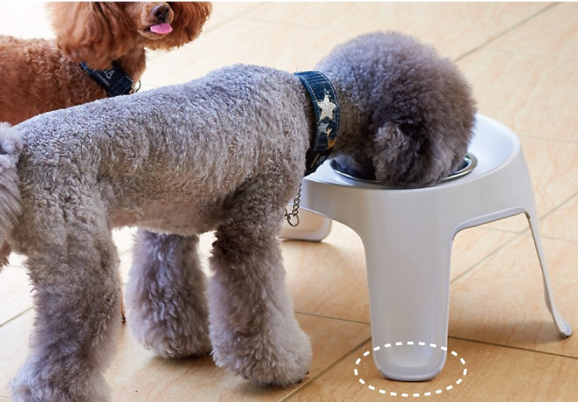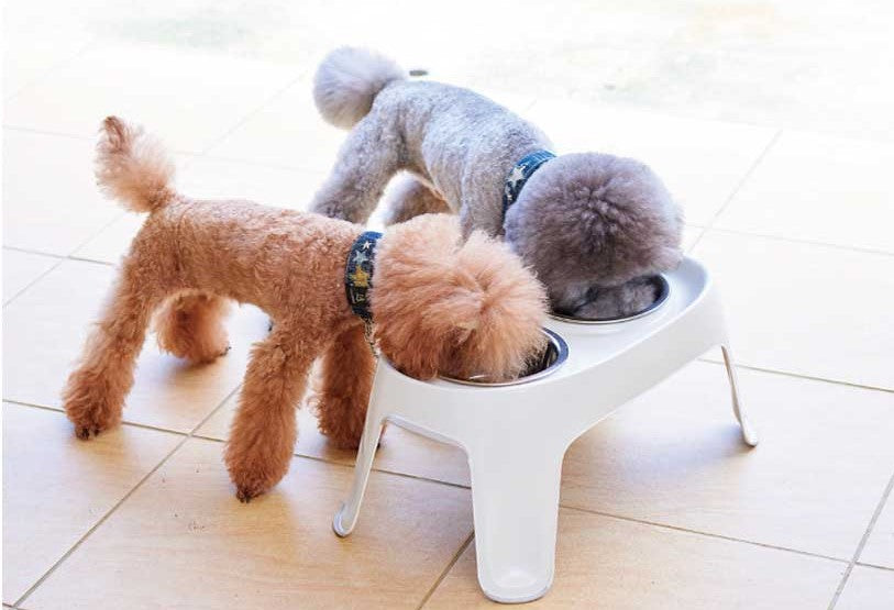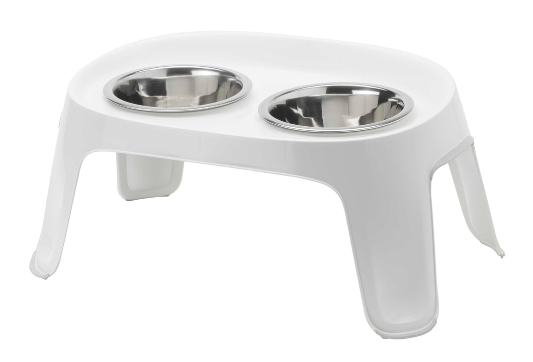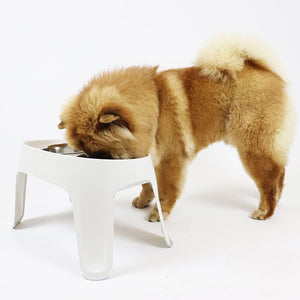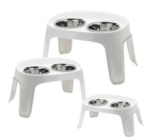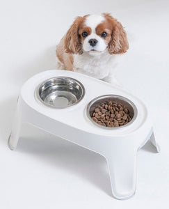 The raised edges will keep your dog’s mess to a minimum and the stand features noise-softening inserts made of rubber that will keep those bowls even more firmly in place. The bowls themselves are stainless steel, making them a breeze to clean; as for the stand, it’s also an easy clean; made with a stable and thick plastic construction to support your dog’s food and water and the weight he puts on the bowls as he eats.