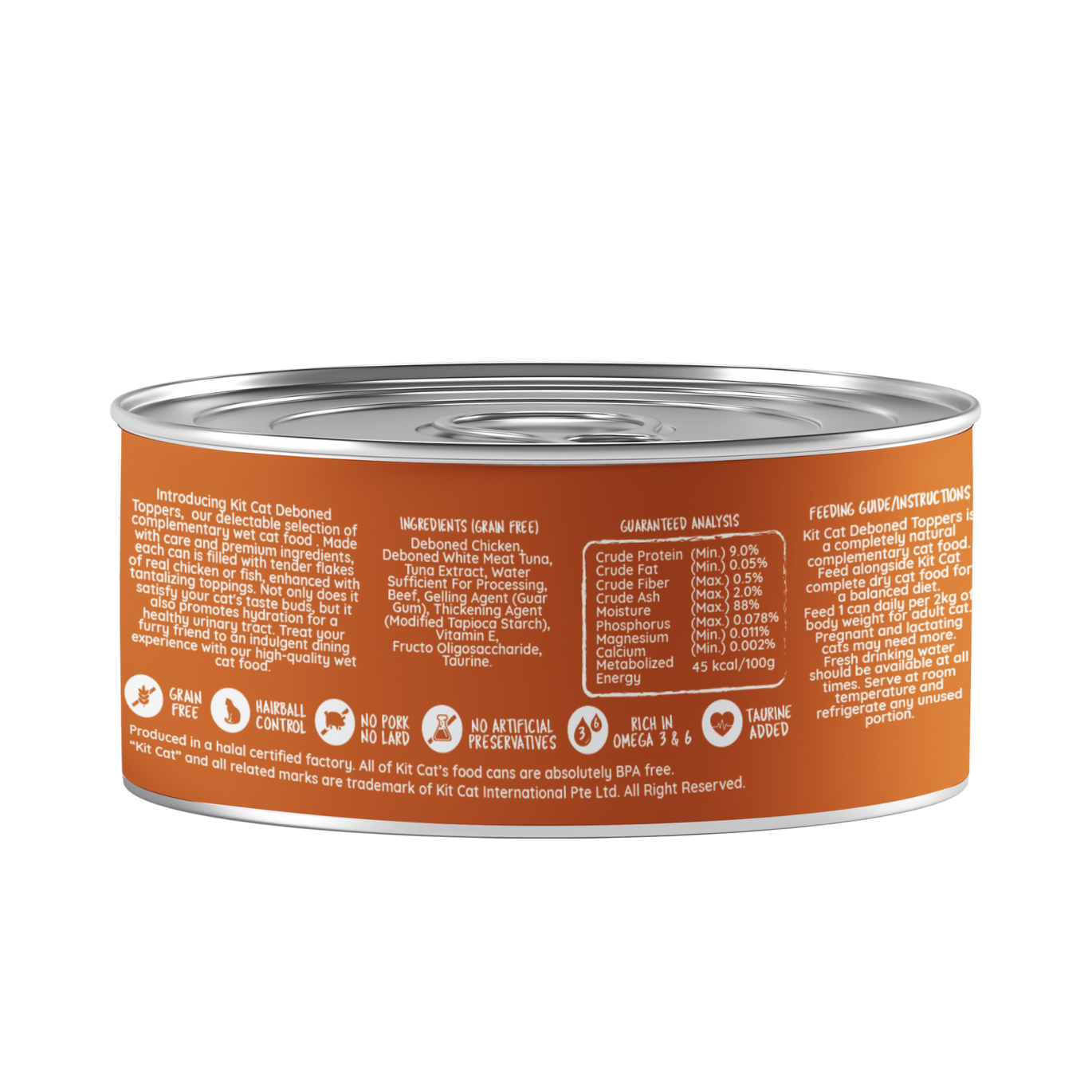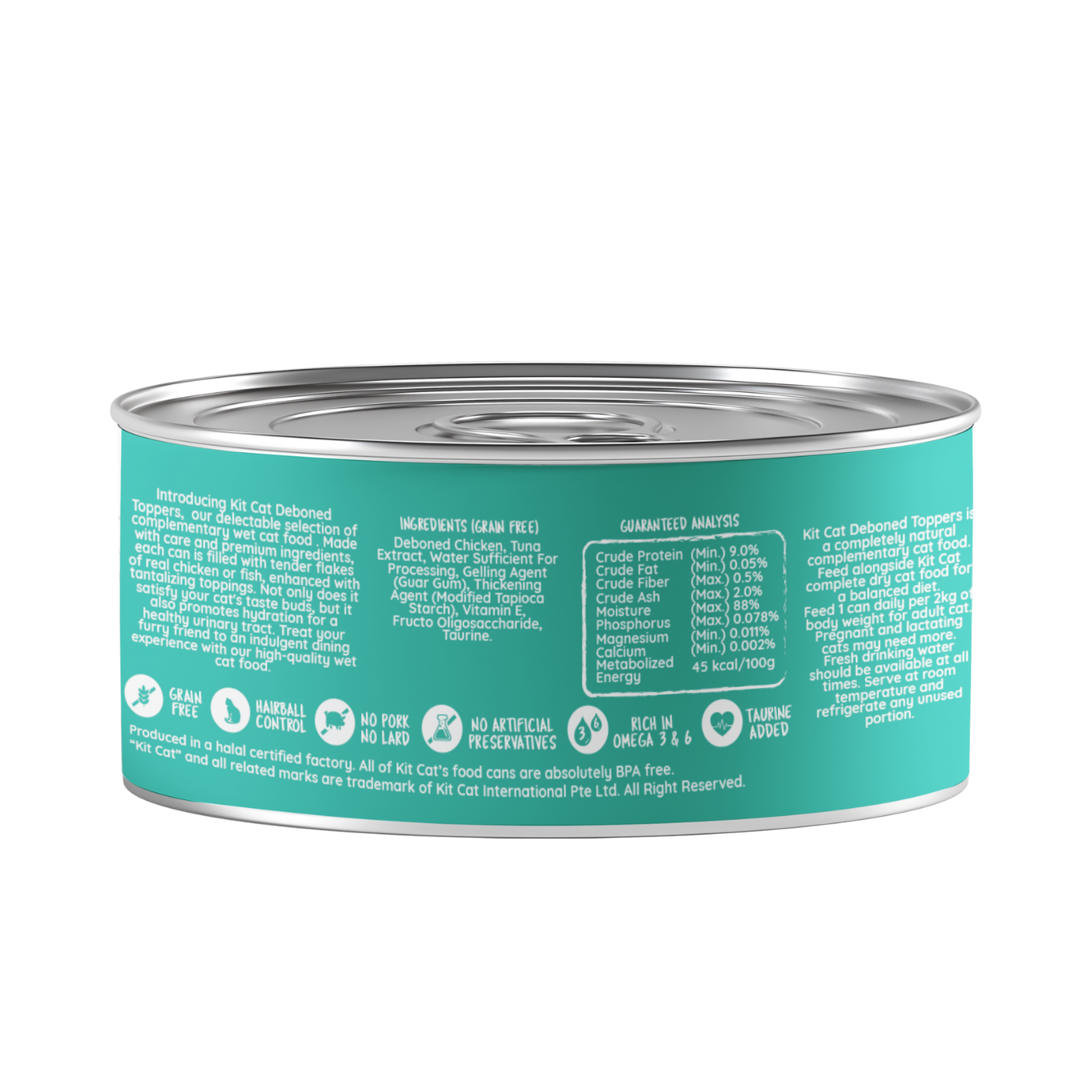 Cats are also obligate carnivores, which means they have a biological requirement for a meat-based diet. Kit Cat Canned Food Toppers are made using selected quality deboned, skinless chicken and/or tuna as a base ingredient. These cans are packed with protein and contain more than 70% protein on a dry matter basis.