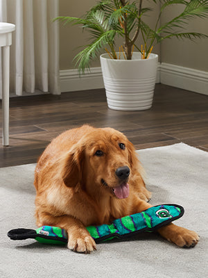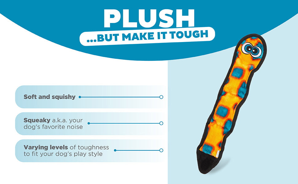 This 3-squeak plush snake dog toy is perfect for fetch, toss, rowdy play, and cuddle time. It strikes the ideal balance between softness and durability, making it great for shaking, thrashing, and extended active play.