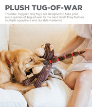 Ready, set, tug! Our plush & corduroy Thunda Tugga appears soft & sweet, but this feisty fella lets out a series of action packed, rapid squeaks when its arms are pulled! Your pooch can munch, bite, chew, and squeak its way to canine bliss. Durable K9 Tuff ™ Guard makes this toy the perfect companion for your best friend.