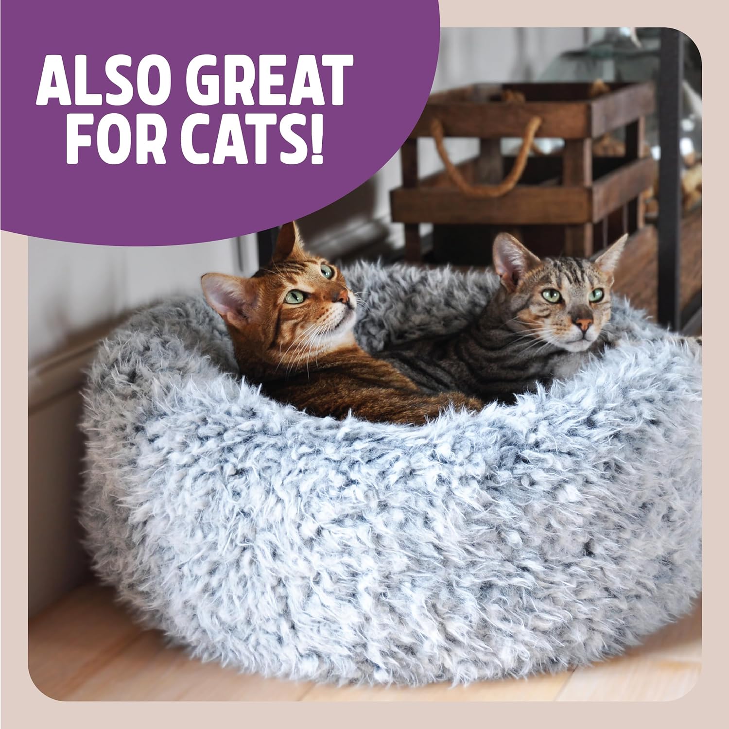 This Silver Fluff Comfort Bed offers ultimate comfort for our pets, featuring super soft faux fur that is self-warming and soothing. The raised edges create a sense of security and provide head and neck support, making it a perfect snuggling spot for your furry friends.