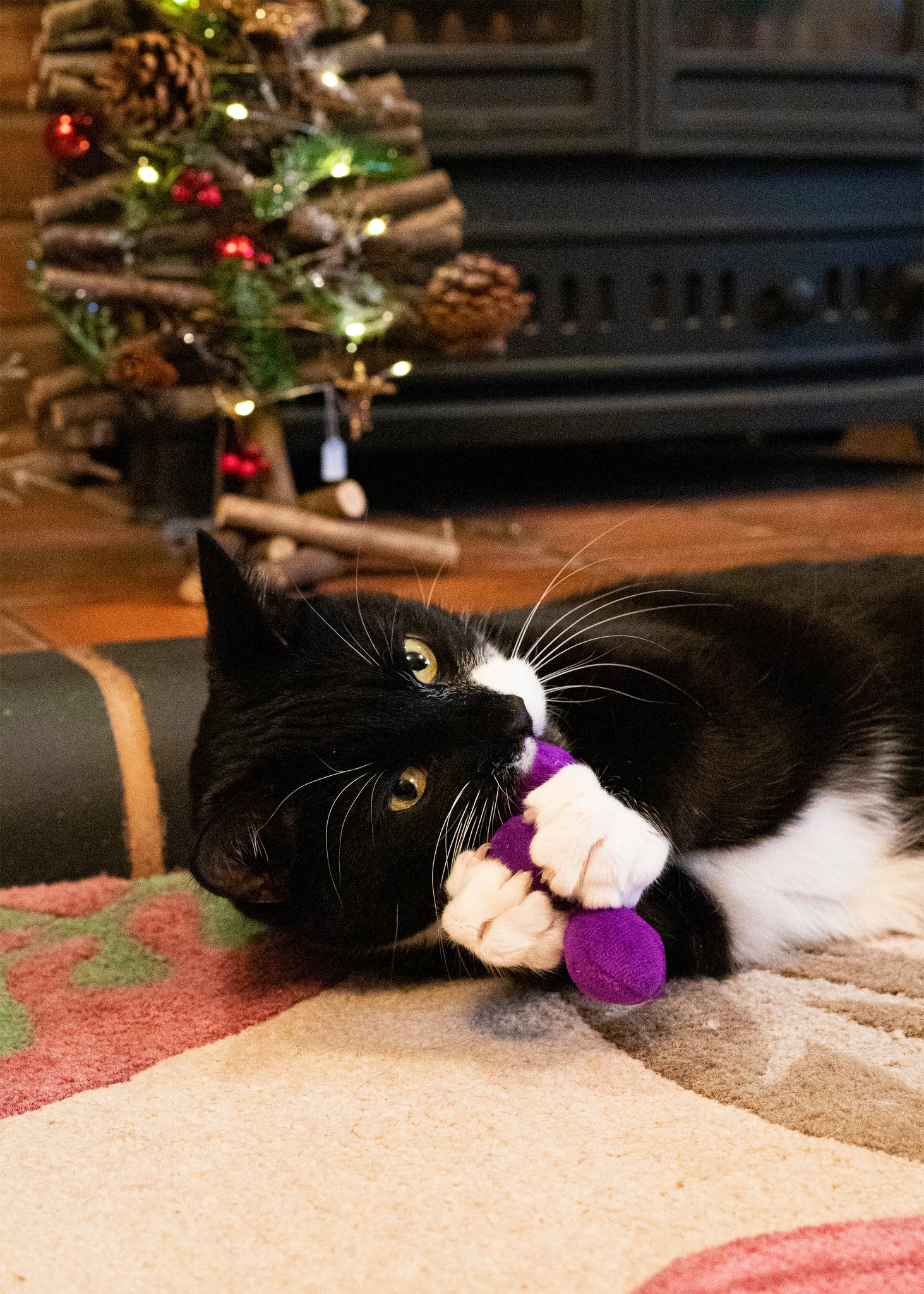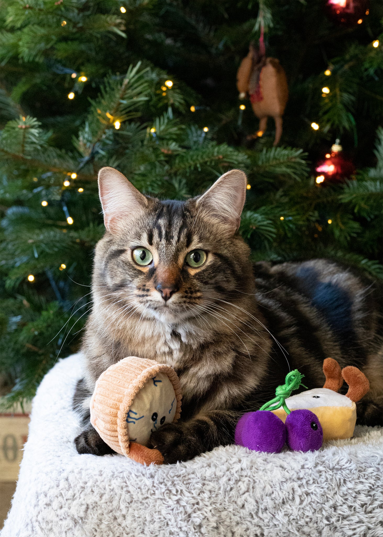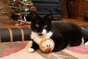The Classic Cheeseboard Trio, is a delightful assortment of Christmas Cheeseboard favourites that will surely satisfy your feline's playtime cravings. This trio includes a Brie slice, a wheel of Stilton, and a side of Grapes, providing a variety of textures and shapes for your cat to enjoy.