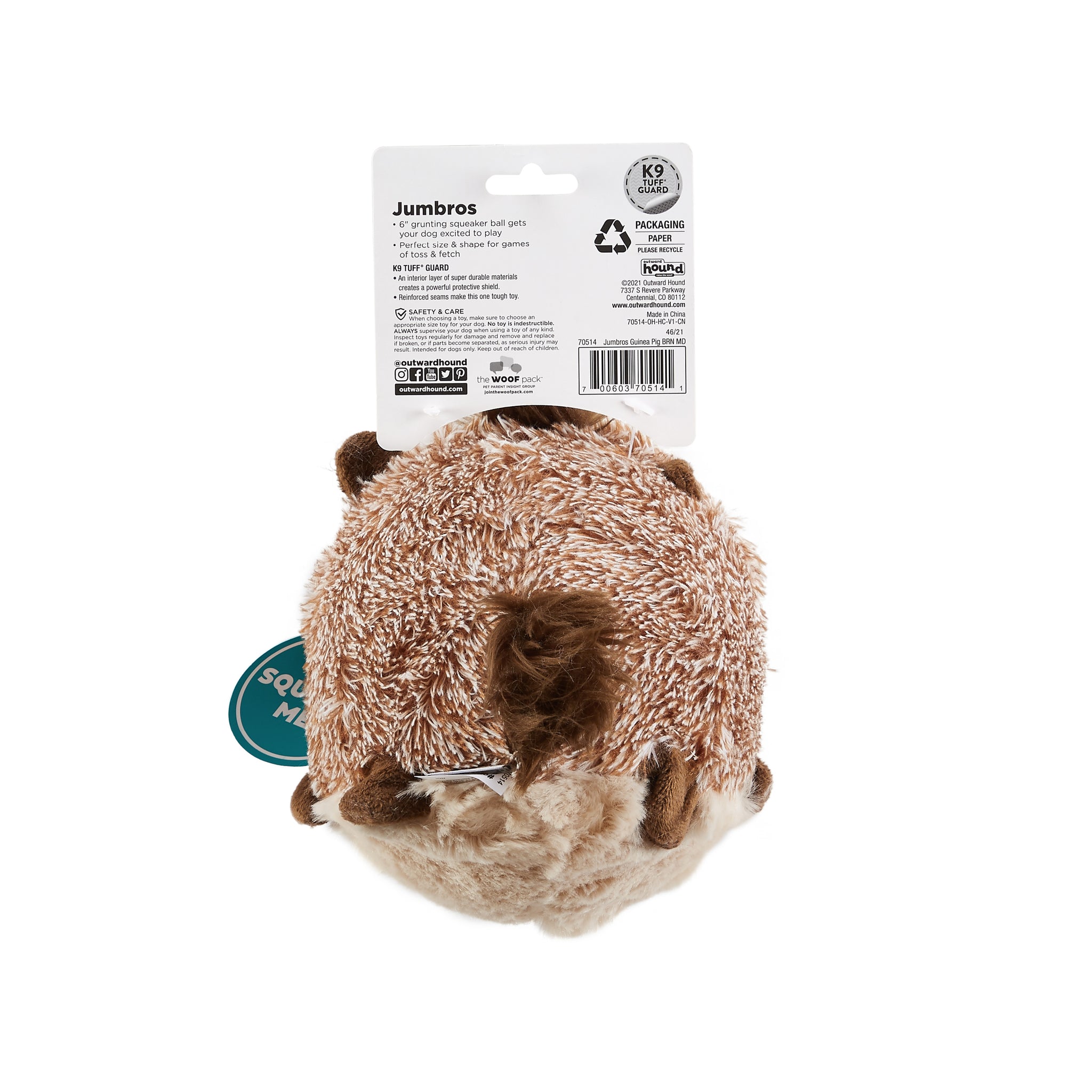 The Jumbros Guinea Pig grunting dog toy by Outward Hound is a fun take on the traditional fetch ball. The dog ball contains a 15.5cm grunting squeaker that emits silly honking sounds that get your dog extra excited to play. Activate your dog's natural instincts to hunt for prey by squeezing the squeaker ball to release the grunting sound, then get ready for a fun and interactive game of fetch and toss! This dog toy features K9 Tuff Guard: an interior layer of super durable materials that creates a powerful protective shield. Reinforced seams make this one tough toy! Available in multiple characters.