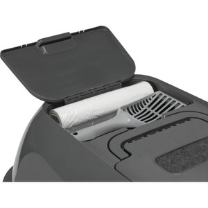 There is a hidden storage that includes 10 liner bags, a scoop, and a charcoal filter to help reduce odors. So super convenient, but also super-secure. Our Mega Deluxe is held together by four solid clip-locks.