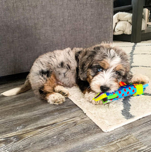 The Cool Teething Stick by Petstages is an ideal solution for teething puppies and dogs with inflamed gums. The bright cotton-poly blend fabric and stuffed interior make freezing and reusing this toy a cinch. Just simply soak in water, place in the freezer, and remove once frozen. Your pup will enjoy the soothing, icy relief and the crunchy texture of that this frozen teething stick provides their achy gums. Fun streamers and ribbon ends add some fun and texture to gnaw on. This toy is free of lead and phthalates. Remove this toy from your dog once it has thawed to extend its usage.