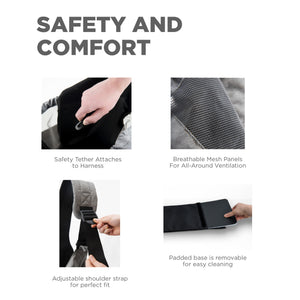 - Stay Right There: Interior safety harness provides added security and clips to your dog’s harness.