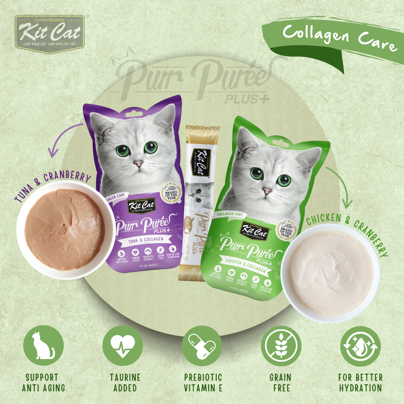The Purr Puree Plus+ range offers four key health benefits, namely Joint Care, Urinary Care, Collagen Care and Skin and Coat in two different flavours i.e. Chicken and Tuna.