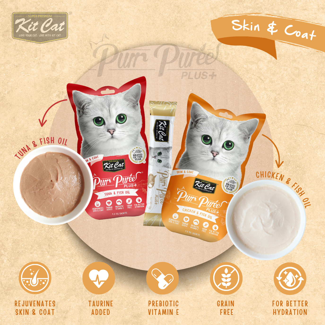 Formulated by nutritionists who are cat lovers, the Kit Cat Purr Puree treats contain only carefully selected natural ingredients with no added colours or preservatives. These treats offer smooth blends of premium deboned chicken or fish suitable for cats of any life stage.