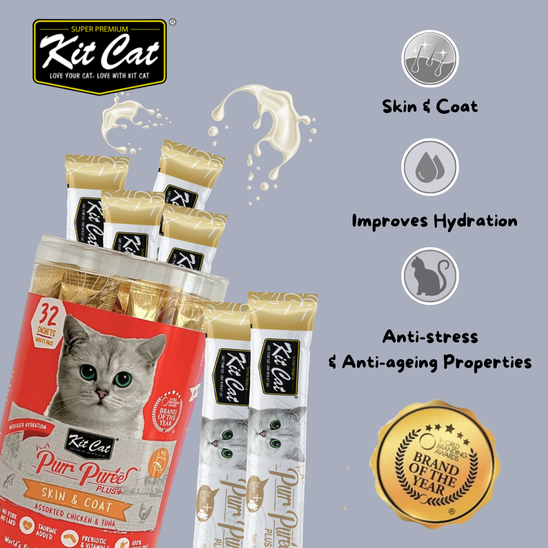 Formulated by nutritionists who are cat lovers, the Kit Cat Purr Puree treats contain only carefully selected natural ingredients with no added colours or preservatives. These treats offer smooth blends of premium deboned chicken or fish suitable for cats of any life stage.