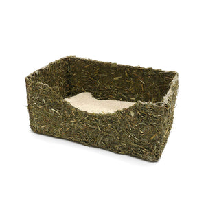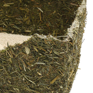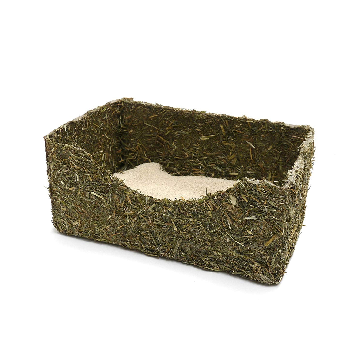 The bathing box is made from edible board coated in meadow hay. Included n the bathing box is a bag of the special sepiolite bathing sand, which is softer and kinder to your pet's fur and helps to absorb excess oils.