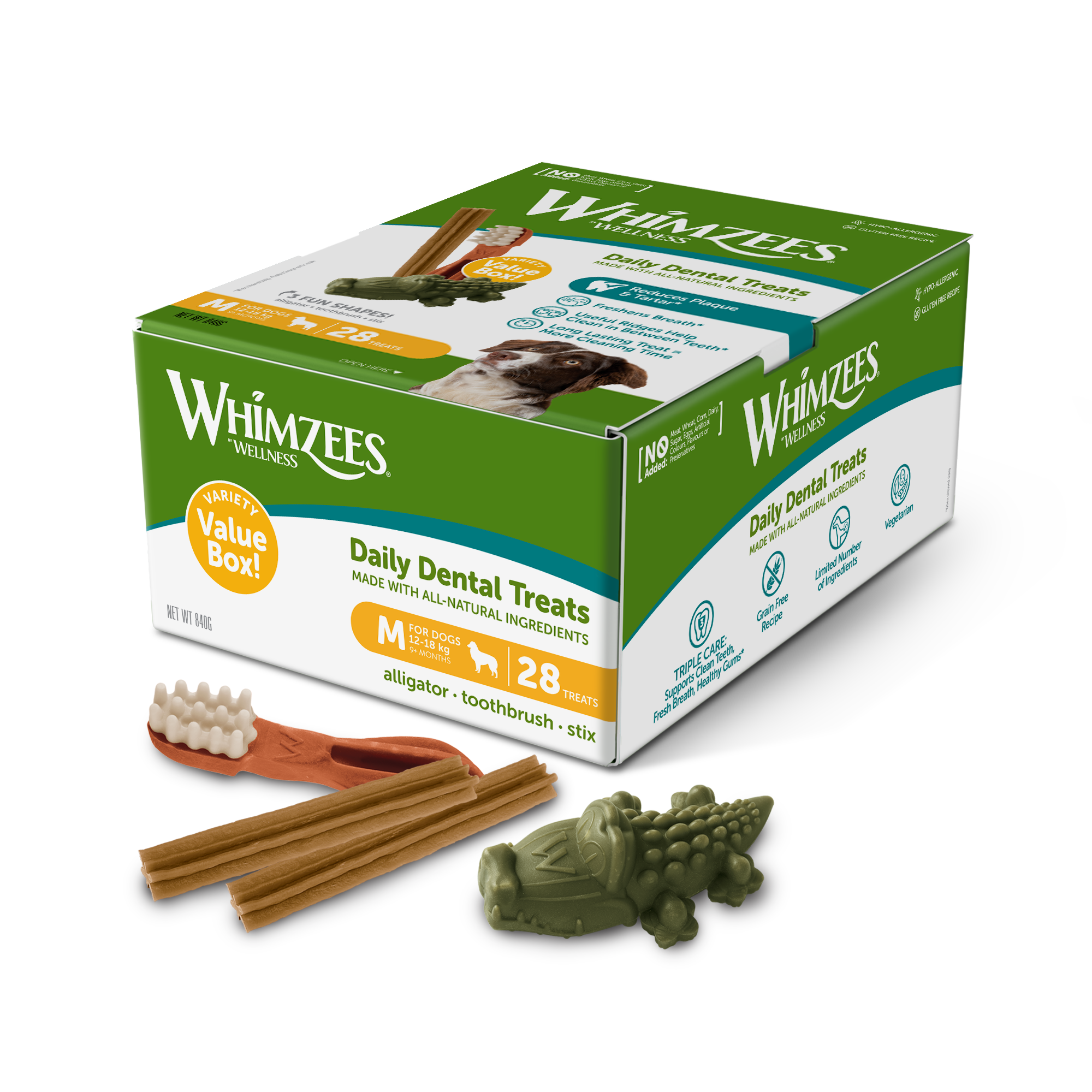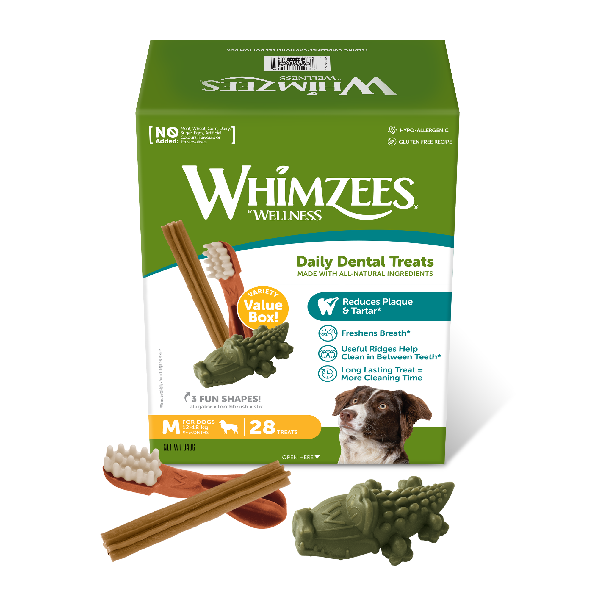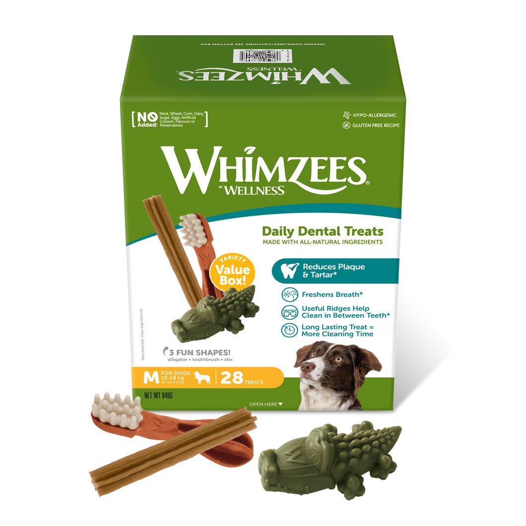 Help your dog maintain healthy teeth and gums with WHIMZEES® Variety Value Box! Did you know that 80% of dogs show signs of dental health issues by the age of three? That's why daily dental care is crucial for your furry friend's well-being. Just like you brush your teeth every day, your dog can benefit from Whimzees dental chews as a daily routine.
