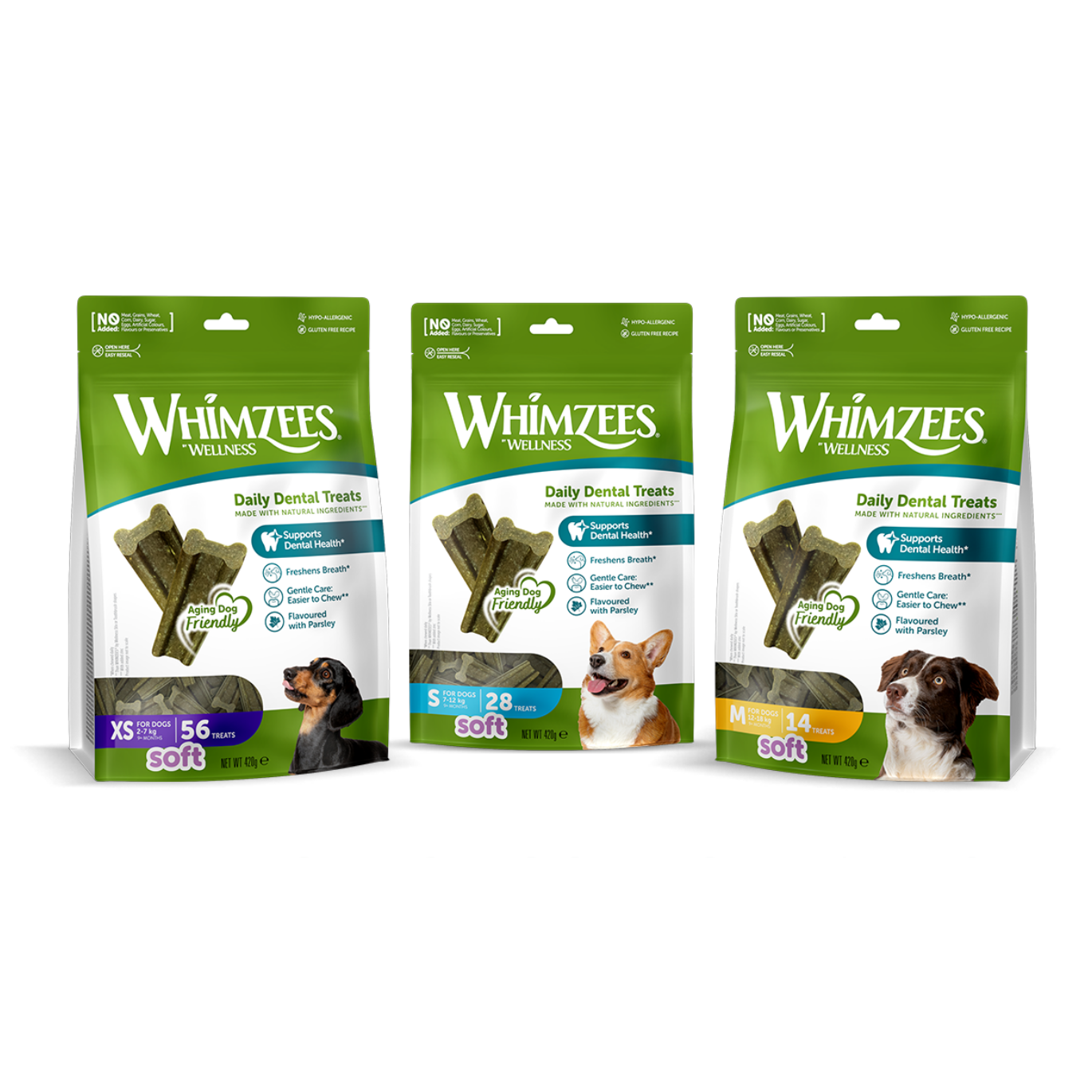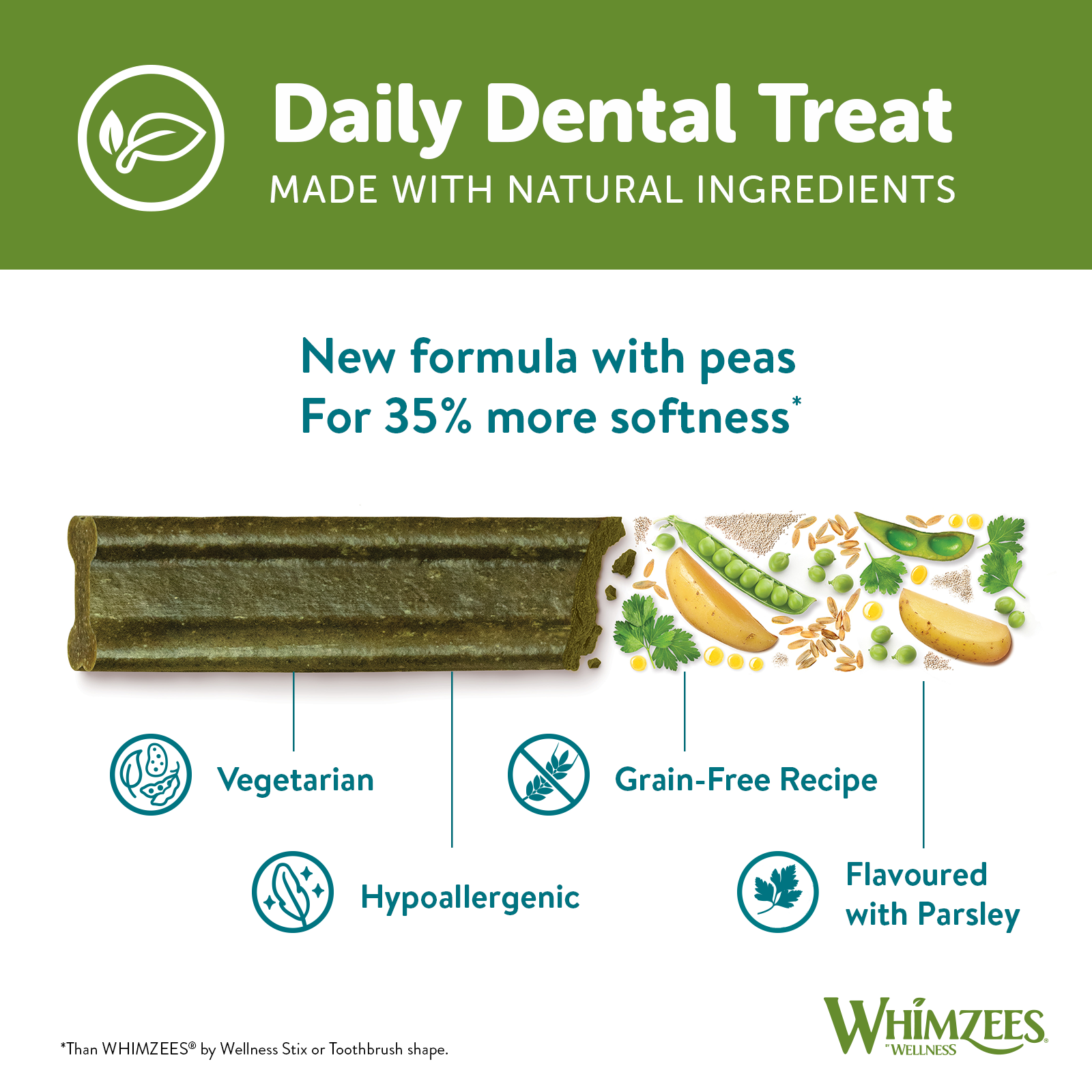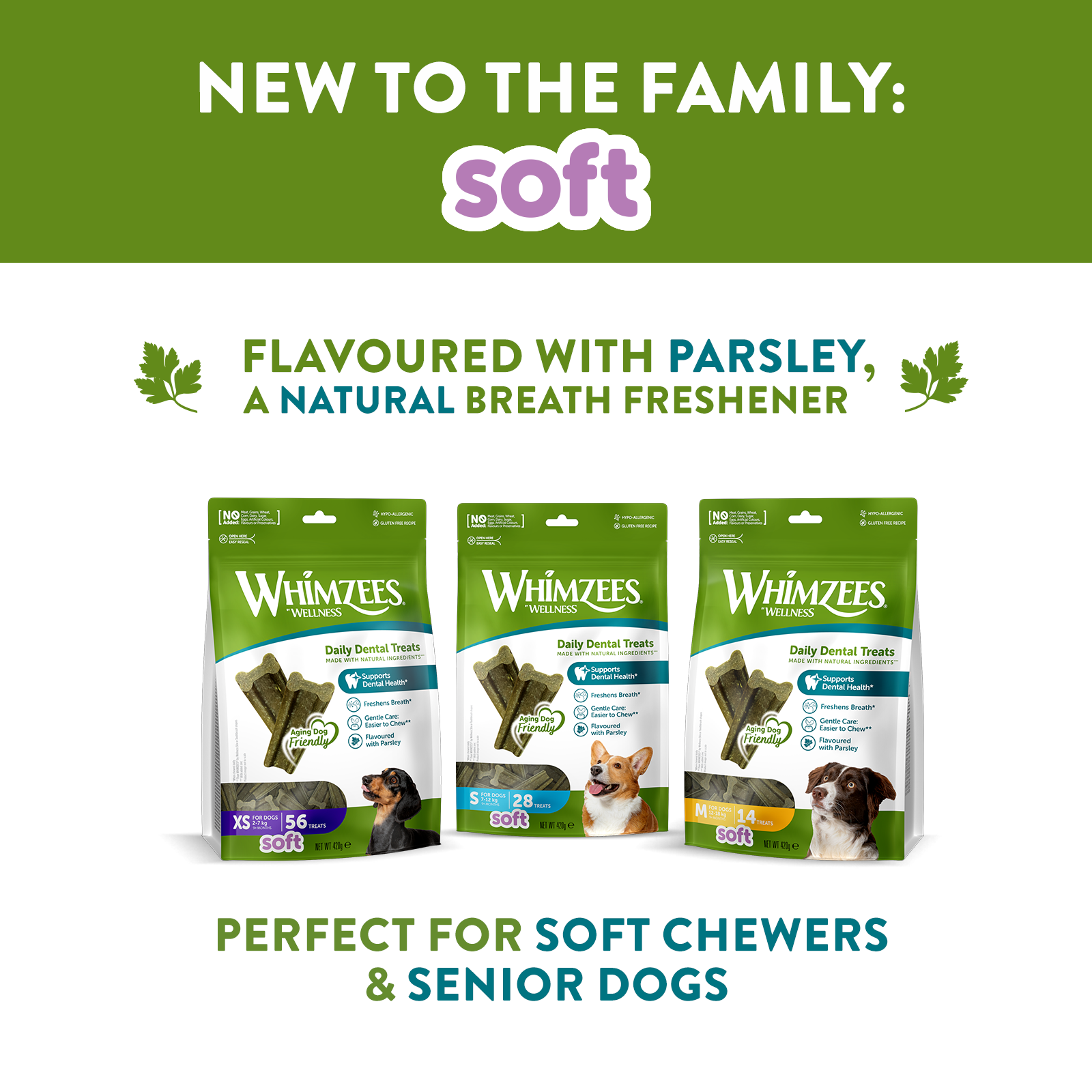 WHIMZEES® by Wellness SOFT, are the newest treats to join the WHIMZEES family. These yummy treats are made with natural, easy-to-digest ingredients. Flavoured with Parsley, a natural breath freshener, these treats are irresistibly delicious. The new and unique SOFT formula delivers a 35% softer texture when compared to our original WHIMZEES® by Wellness Adult Stix or Toothbrush. SOFT provides an excellent, gentle cleaning solution for aging dogs and those that prefer a softer chewing experience.