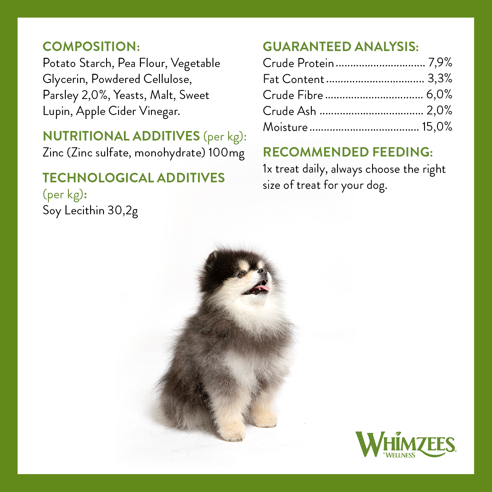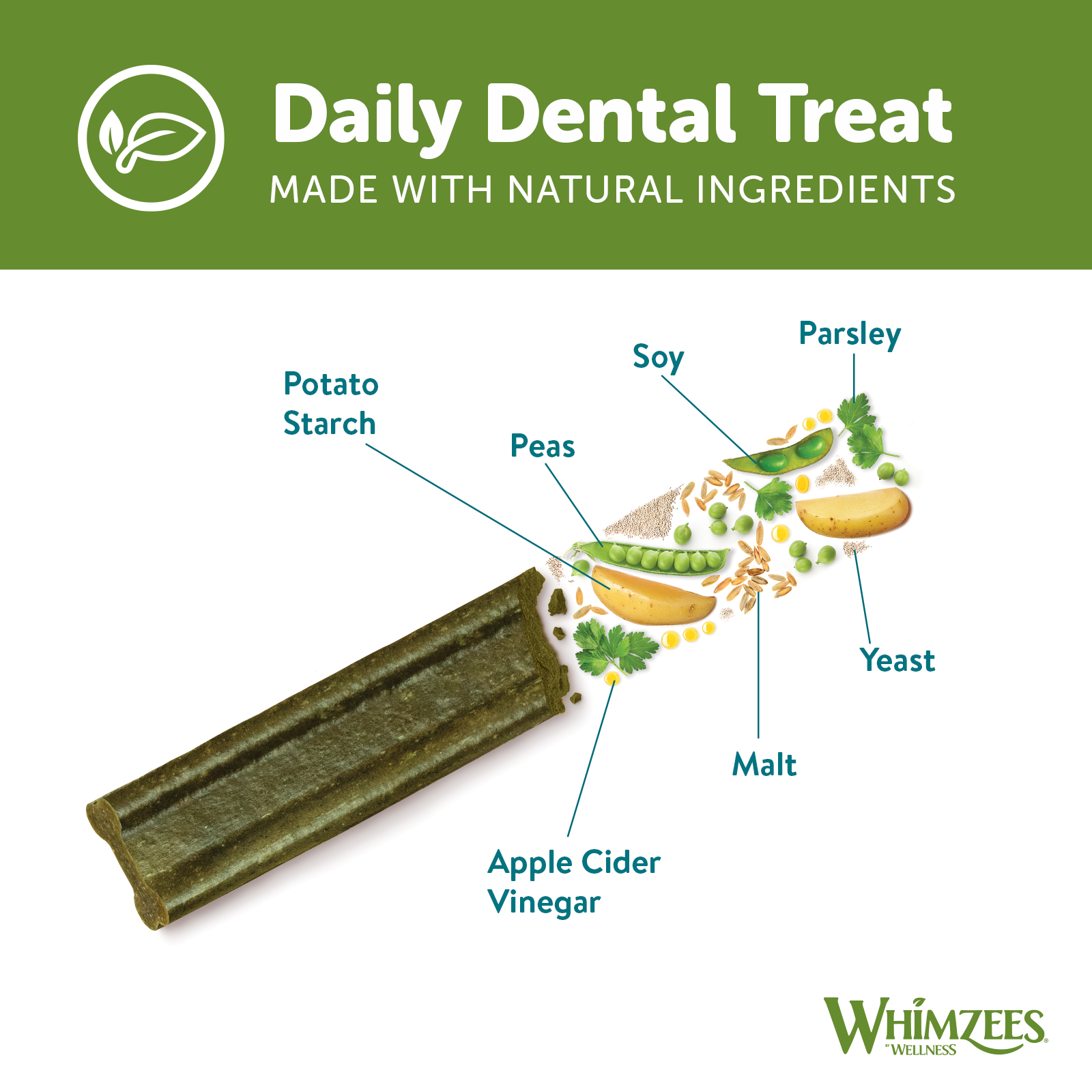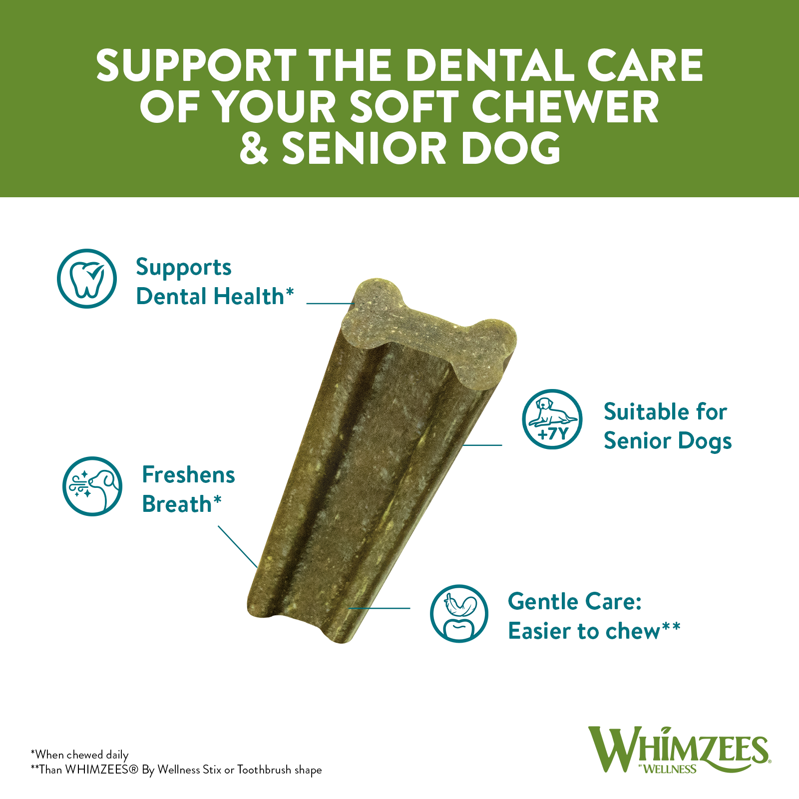 WHIMZEES® by Wellness SOFT, are the newest treats to join the WHIMZEES family. These yummy treats are made with natural, easy-to-digest ingredients. Flavoured with Parsley, a natural breath freshener, these treats are irresistibly delicious. The new and unique SOFT formula delivers a 35% softer texture when compared to our original WHIMZEES® by Wellness Adult Stix or Toothbrush. SOFT provides an excellent, gentle cleaning solution for aging dogs and those that prefer a softer chewing experience.
